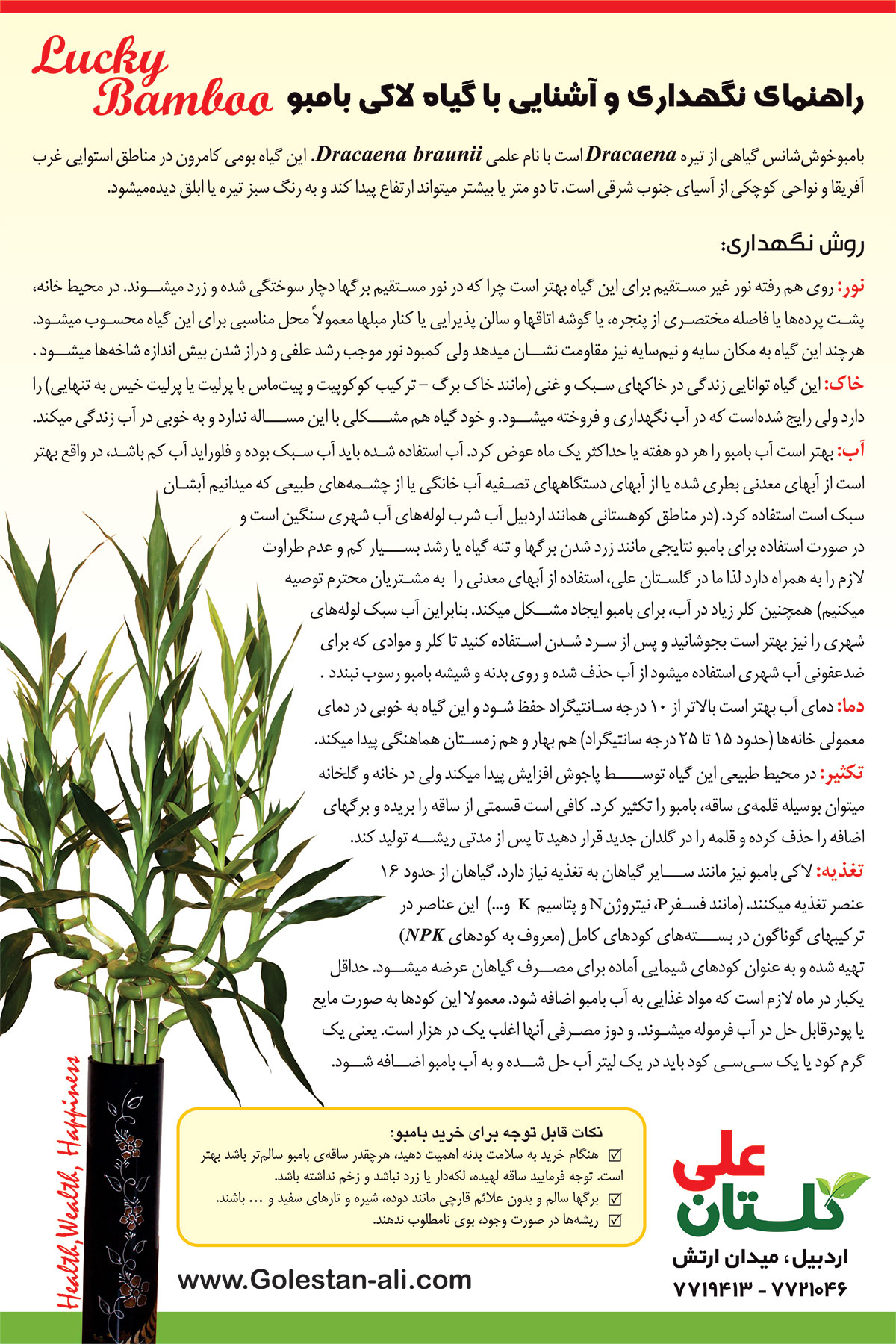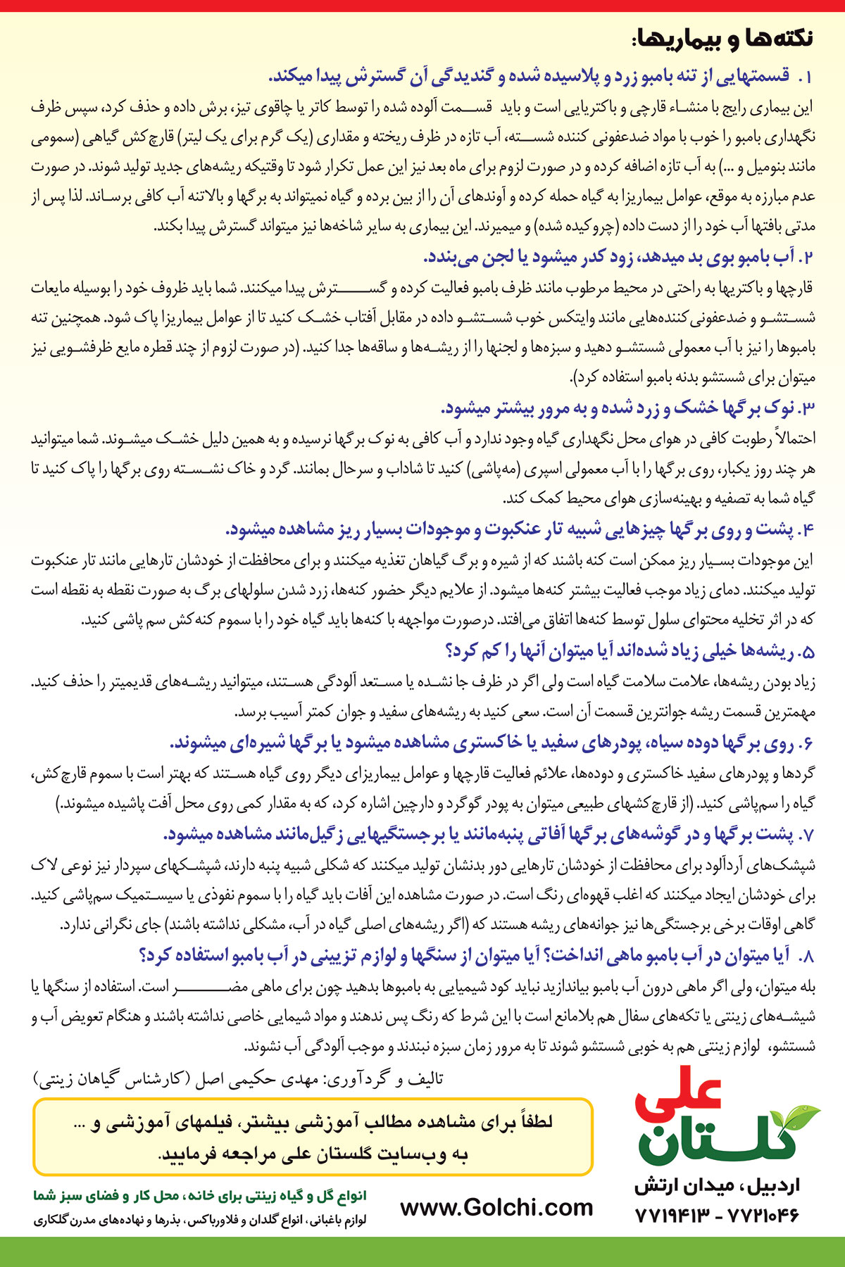 بهتر است آب بامبو را هر دو هفته یا حداکثر یک ماه عوض کرد. آب استفاده شده باید آب سبک بوده و فلوراید آب کم باشد، در واقع بهتر است از آب‌های معدنی بطری شده یا از آبهای دستگاههای تصفیه آب خانگی یا از چشمه‌های طبیعی که میدانیم آبشان سبک است، استفاده کرد. (در مناطق کوهستانی همانند اردبیل آب شرب لوله‌های آب شهری سنگین است و در صورت استفاده برای بامبو نتایجی مانند زرد شدن برگها و تنه گیاه یا رشد بسیار کم و عدم طراوت لازم را به همراه دارد. لذا ما در گلستان علی آب چشمه واتا را به مشتریان محترم توصیه میکنیم.). همچنین کلر زیاد در آب برای بامبو مشکل ایجاد میکند.