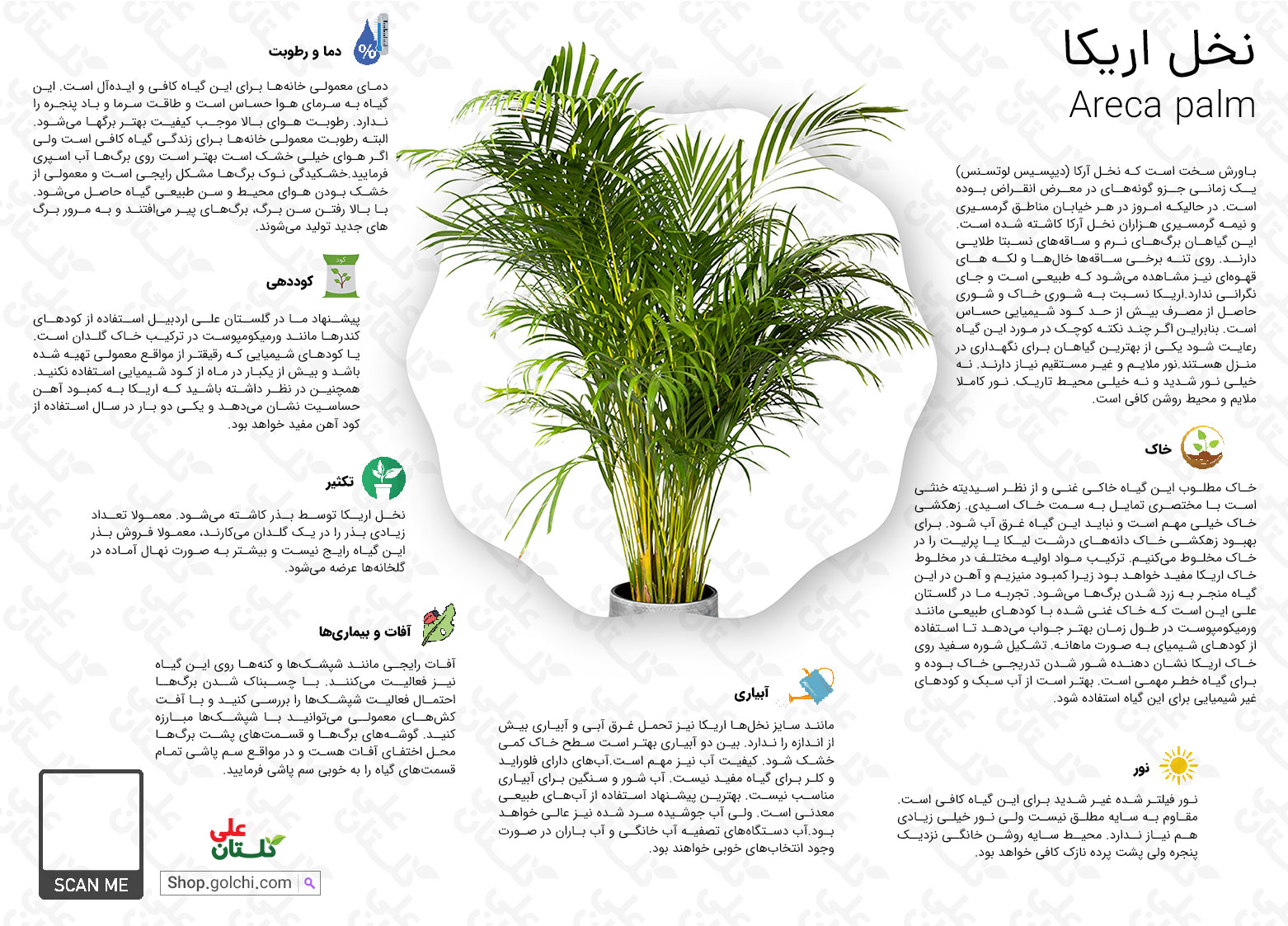 نخل اریکا Areca palm Dypsis lutescens از نخلهای بسیار زیبای جدید که در ایران در دهه اخیر در محیط منزل و کار مورد استفاده قرار میگیرد. بسیار مقاوم است و به نور متوسط و آبیاری متوسط و دمای متوسط نیازمند است. در شرایط مساعد خوب رشد میکند و در آپارتمانها ماندگاری خوبی از خود نشان میدهد.